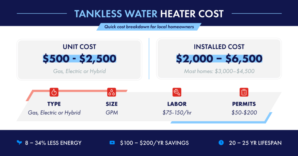 - Equipment Cost: $500–$2,500 depending on type (electric, gas, or hybrid), capacity (GPM), and brand